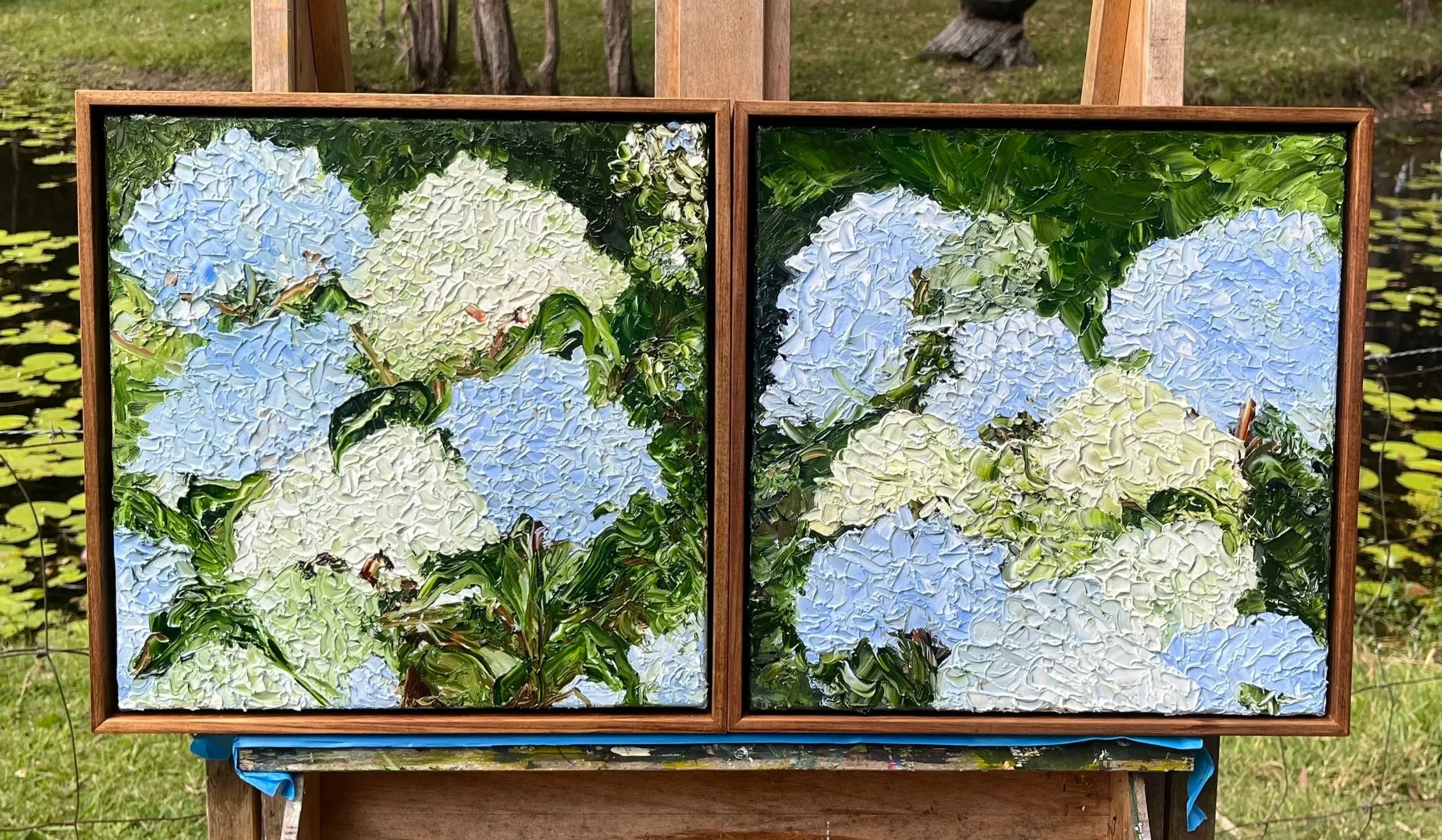 This week in my world at the studio I ordered new canvases for commissions, spent time at the post office shipping scarves (I hear they have landed in your hands!), I organised the print orders, I helped people frame prints (in case you missed out, I made videos for you here and here), and I varnished and framed three commissions (the two hydrangeas above and the beautiful seaside floral, below).